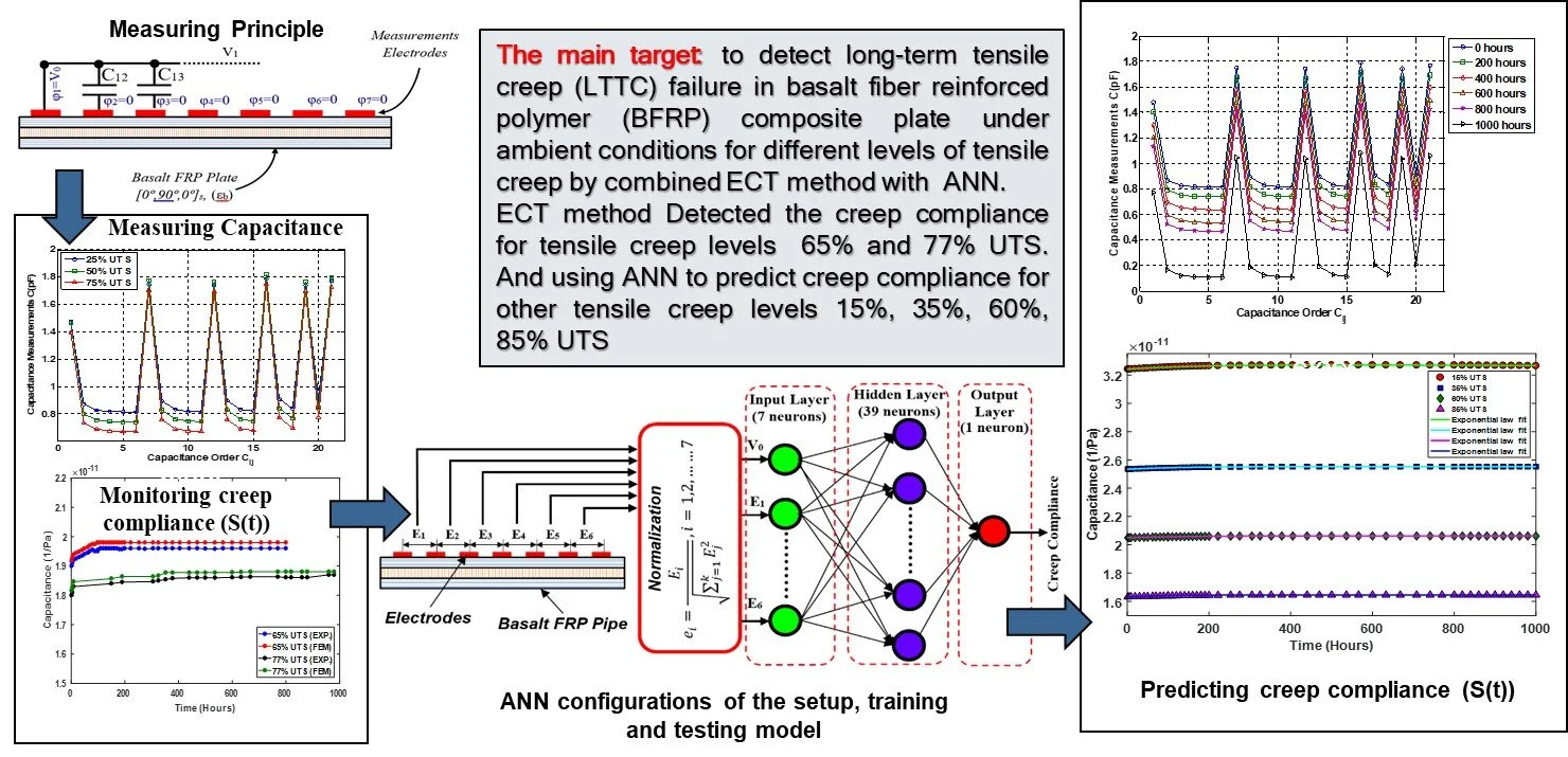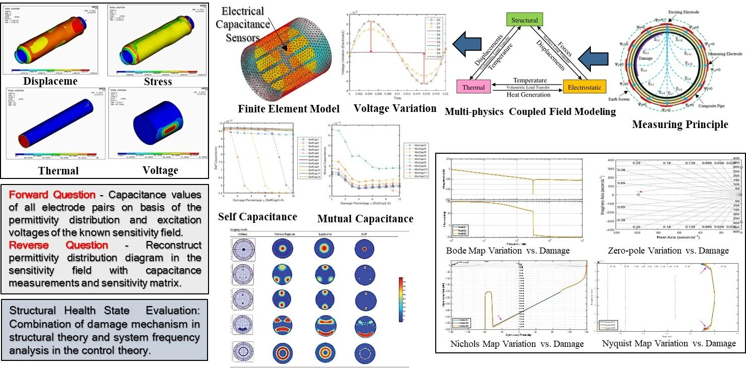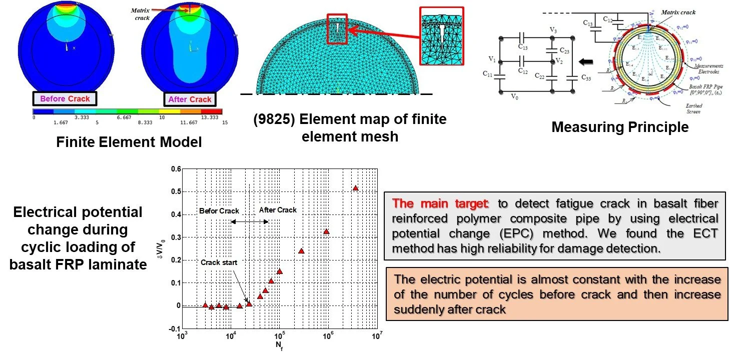 An ECS technique is employed to measure electrical potential differences on composite pipeline surfaces, correlating with changes in dielectric properties from long-term water pressure loads inside.