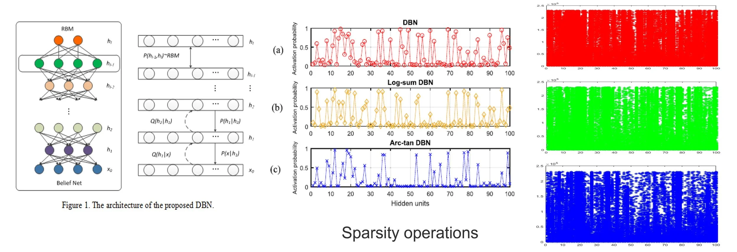 Quantity of the hidden units of DBN, log-sum DBN, and arctan DBN, with an activation probability exceeding 0.5, are 30, 26, and 18.