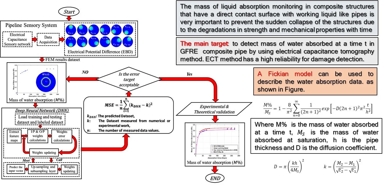 A multi-physics FEM integrated with an RKRNN is designed for ECS-adorned GFRE composite pipelines under water pressure, enabling estimations of pipeline degradation by factoring in uncertainties from measurements, predictions, and other inputs.