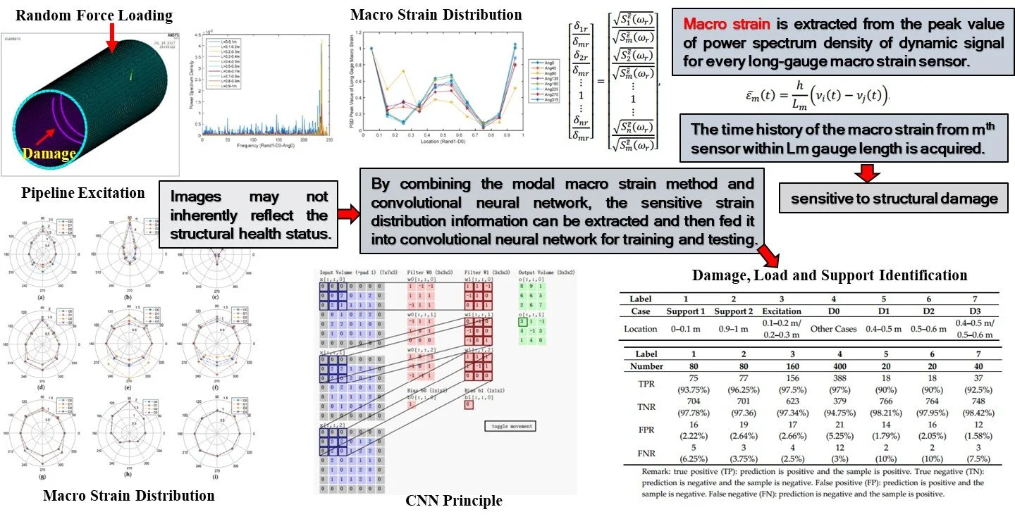Deep Learning-Based Damage, Load and Support Identification for a Composite Pipeline by Extracting Modal Macro Strains from Dynamic Excitations