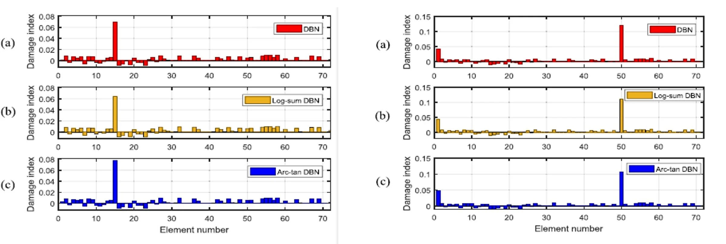Arctan DBN performs better than the DBN and the log-sum DBN in damage identification, even when the incomplete and uncertain modal data are used.